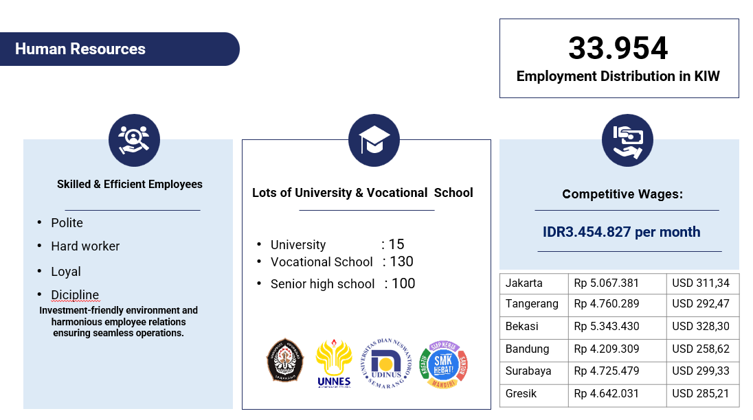 KIW is surrounded by various higher education, vocational, and job training institutions that produce graduates who are ready to work and skilled in their fields. This provides companies with broad access to high-quality local workers. In addition, local government support for human resource competency development helps increase the competitiveness of industries in this region. The availability of these excellent human resources is very important in supporting long-term business growth and the sustainability of company operations.