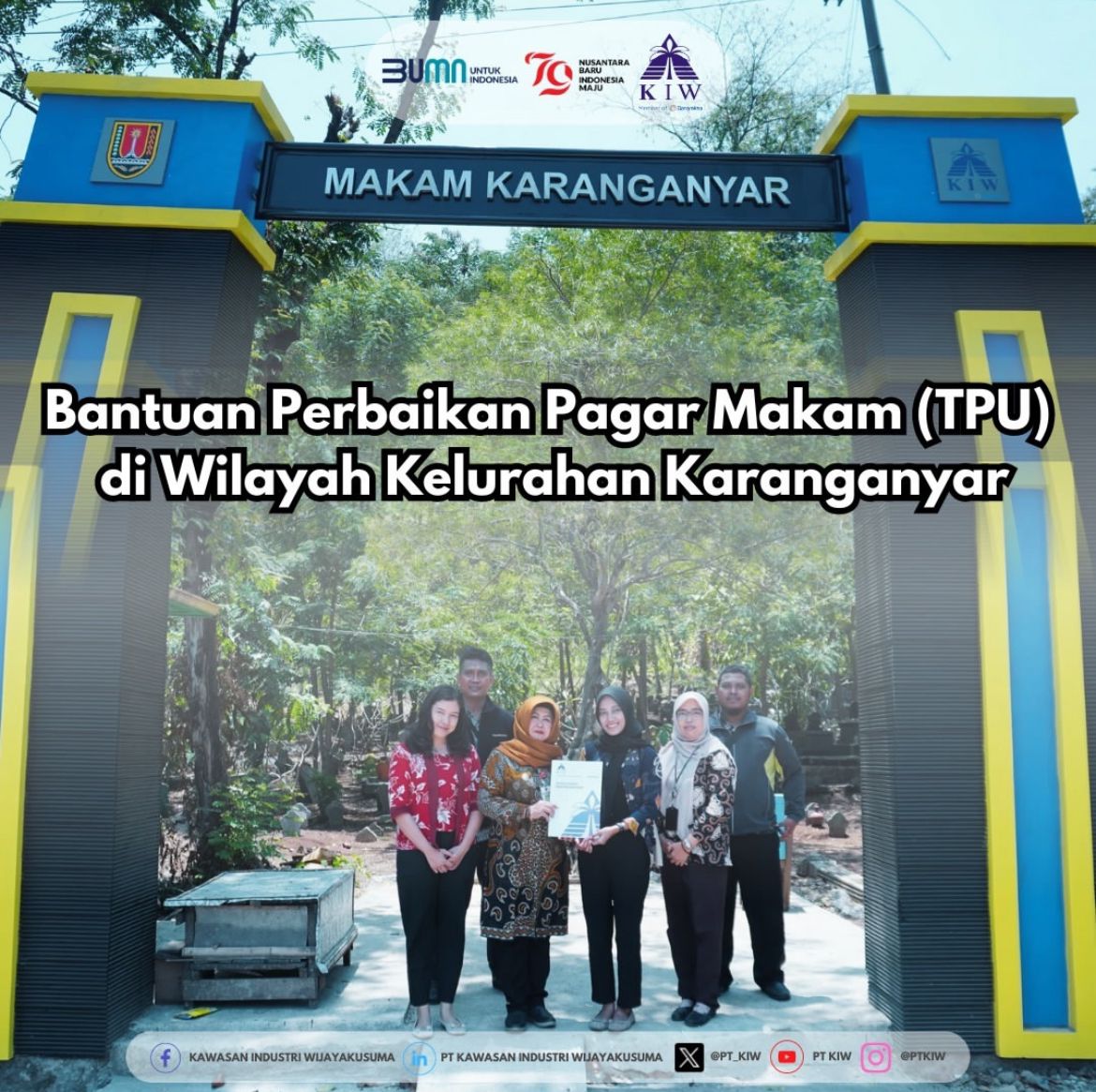 PT Kawasan Industri Wijayakusuma (KIW) melalui program Tanggung Jawab Sosial dan Lingkungan (TJSL) melaksanakan penyerahan bantuan secara simbolis untuk perbaikan Tempat Pemakaman Umum (TPU) di Kelurahan Karanganyar. Penyerahan bantuan tersebut dilakukan oleh Atika Rahma, Plt. Department Head Corcom & CESR PT KIW, kepada Lurah Karanganyar, Ibu Rozikhah, pada Kamis, 19 September 2024.