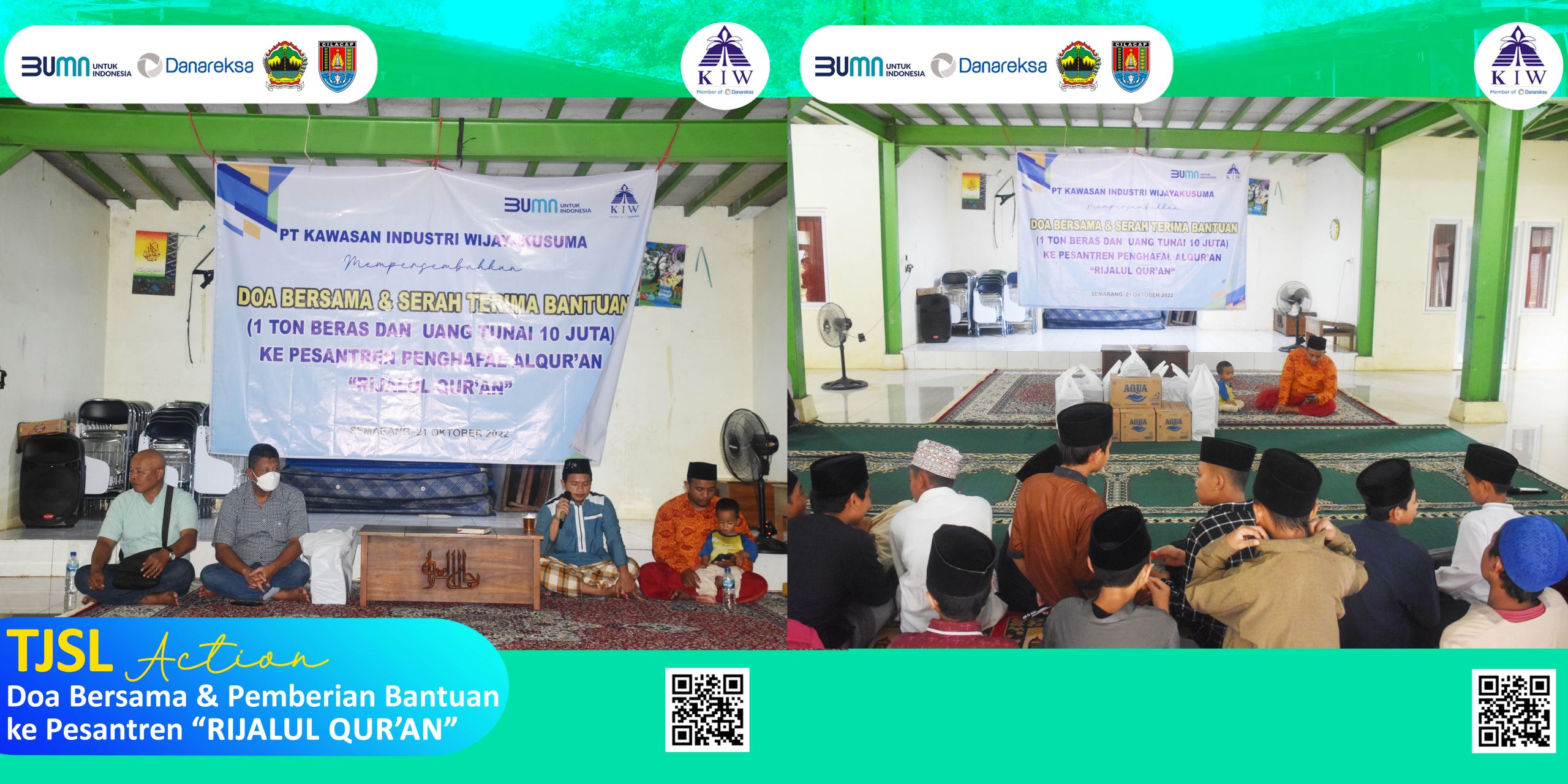 Pada hari Jum,at yang penuh keberkahan tanggal 21 Oktober 2022, PT Kawasan Industri Wijayakusuma (PT KIW) melakukan kegiatan sosial dengan memberikan sumbangan berupa beras sebanyak 100 Kg serta uang tunai sebesar 10 juta rupiah kepada Pesantren Penghafal Al-Qur’an Rijalul Qur’an yang bertempat di kecamatan Gunungpati Kota Semarang. Ini dilakukan dalam rangka program Tanggung Jawab Sosial Lingkungan (TJSL) serta dilaksanakannya doa bersama untuk kelancaran proses bisnis PT KIW.