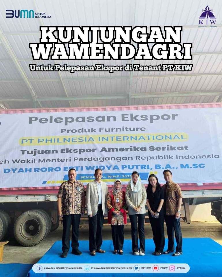 Semarang --- Dalam upaya mendukung peningkatan kinerja ekspor nasional, Kawasan Industri Wijayakusuma (KIW) kembali menunjukkan peran strategisnya dalam mendukung pertumbuhan industri berbasis ekspor. Pada kesempatan istimewa ini, PT Kawasan Industri Wijayakusuma (Persero) menerima kunjungan Wakil Menteri Perdagangan Republik Indonesia, yang hadir langsung ke kawasan untuk melepas ekspor produk furnitur dari salah satu tenant PT KIW, yakni PT Phillnesia International.