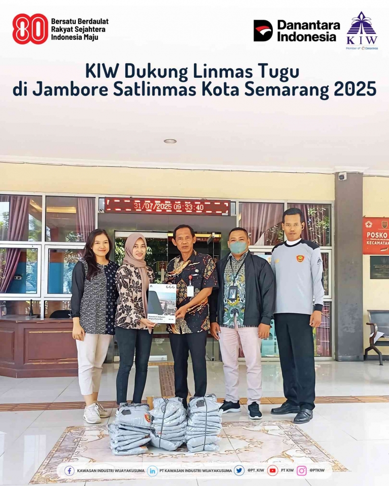Dalam rangka mendukung kegiatan Jambore Satlinmas Tingkat Kota Semarang Tahun 2025 serta memperingati Hari Ulang Tahun Kemerdekaan Republik Indonesia ke-80, PT Kawasan Industri Wijayakusuma (KIW) memberikan bantuan berupa kaos kepada 30 anggota Satuan Perlindungan Masyarakat (Satlinmas) Kecamatan Tugu, Kota Semarang.