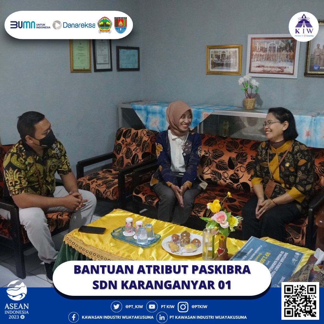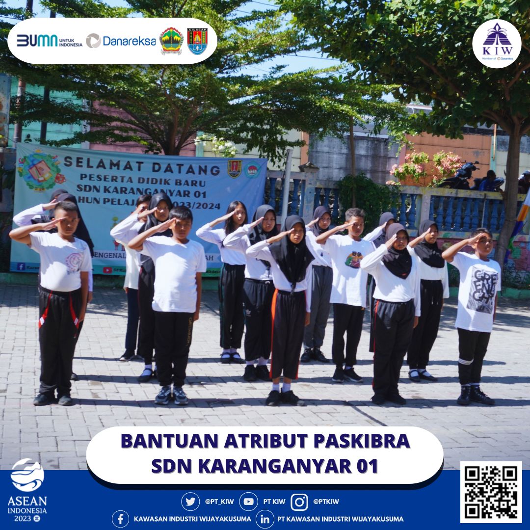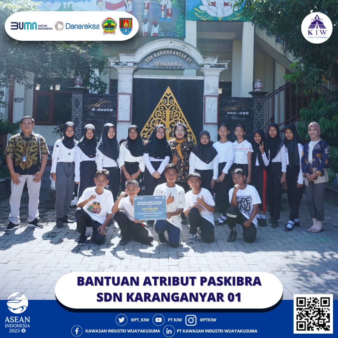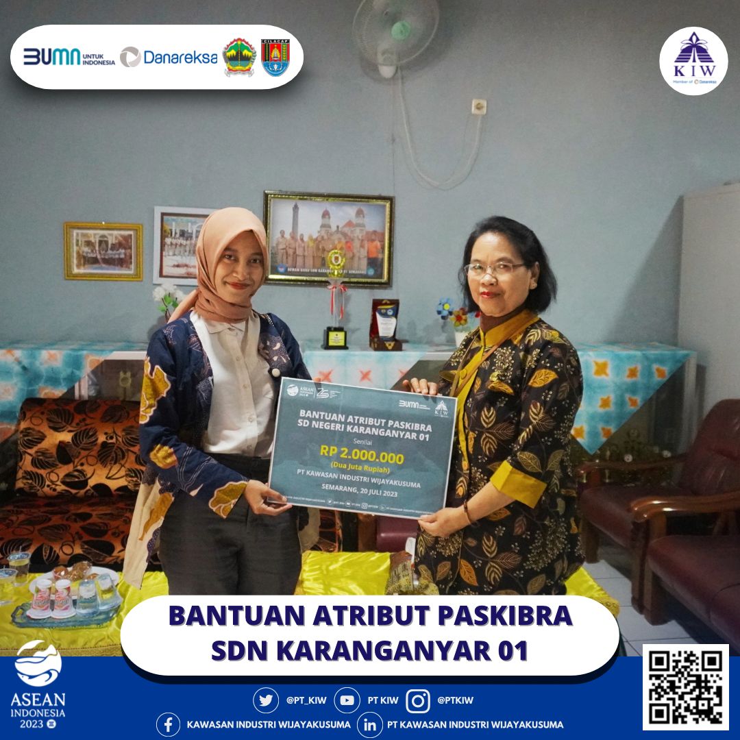 Semarang, 20 Juli 2023 - PT Kawasan Industri Wijayakusuma (KIW) memberikan bantuan berupa atribut Paskibra bagi siswa-siswi yang tergabung dalam Paskibra SDN Karanganyar 01. Bantuan ini secara simbolis diberikan oleh Atika Rahma Fitriani, selaku Specialist Corcom & CESR PT KIW, kepada Ibu Dra. Suyatmi, yang merupakan Kepala Sekolah di SDN Karanganyar 01.