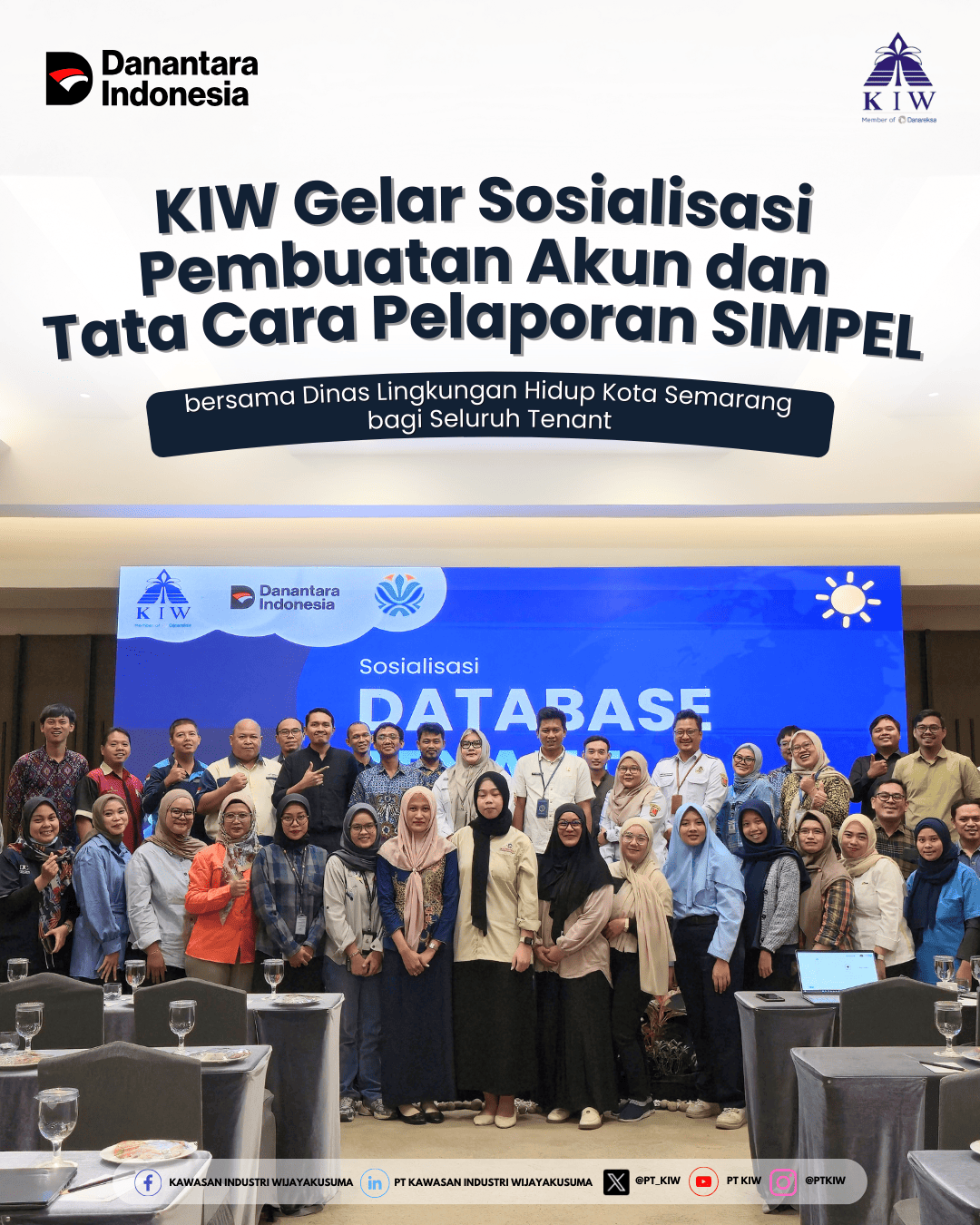 PT Kawasan Industri Wijayakusuma (KIW) resmi melaksanakan kegiatan Sosialisasi Pembuatan Akun dan Tata Cara Pelaporan Sistem Informasi Pelaporan Elektronik Lingkungan Hidup (SIMPEL) sebagai bentuk dukungan terhadap peningkatan kepatuhan pelaporan pengelolaan lingkungan oleh seluruh tenant di kawasan industri. Kegiatan ini berlangsung pada Rabu, 10 Desember 2025 bertempat di Mahima Hotel, Kota Semarang.