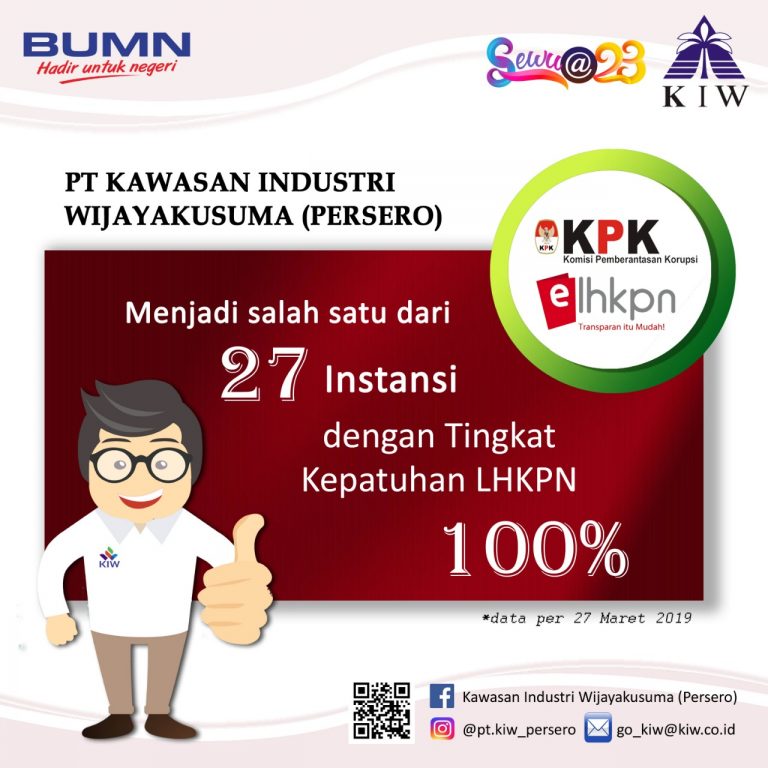 Adapun daftar instansi yang telah mendapat apresiasi dari KPK atas tingkat kepatuhan LHKPN 100% adalah : 1. PT. Kawasan Industri Wijayakusuma (Persero) 2. Badan Penyelenggara Jaminan Sosial Kesehatan 3. Pemerintah Kota Batam 4. Pemerintah Kabupaten Tapanuli Selatan 5. Pemerintah Kabupaten Sumbawa 6. PT Bank Jambi 7. Pemerintah Kabupaten Dharmasraya 8. Pemerintah Kota Gorontalo 9. Pemerintah Kabupaten Pamekasan 10. DPRD Kabupaten Musi Banyuasin 11. Pemerintah Kabupaten Boyolali 12. DPRD Kabupaten Boyolali 13. DPRD Kabupaten Luwu Utara 14. DPRD Kabupaten Halmahera Selatan 15. DPRD Kabupaten Alor 16. DPRD Kabupaten Tana Toraja 17. DPRD Kabupaten Merauke 18. DPRD Kabupaten Batanghari 19. DPRD Kabupaten Bangka Tengah 20. DPRD Kota Gorontalo 21. DPRD Kabupaten Barru 22. DPRD Kabupaten Humbang Hasundutan 23. DPRD Kabupaten Malinau 24. DPRD Kabupaten Boven Digoel 25. PD Air Bersih Tirta Utama Jawa Tengah 26. PD Taman Satwa Kebun Binatang Surabaya 27. PT Cemani Toka .--------------------------------------------------Jual Lahan Industri Indonesia, Jual Lahan Industri Semarang, Jual Tanah Industri Indonesia, Jual Tanah Industri Semarang, Jual Kaveling Industri Indonesia, Jual Kaveling Industri Semarang, Parcel Land for Industry, Sewa Bangunan Pabrik Siap Pakai, Sewa Pabrik, Sewa Gudang, Bangunan Pabrik Siap Pakai, BPSP, Standard Factory Building, SFB, Standard Factory Building for Rent, SFB for Rent, Industial Estate, Indonesia Industrial Estate, Semarang Industrial Estate, Wijayakusuma Industrial Estate, Kawasan Industri, Kawasan Industri Indonesia, Kawasan Industri Semarang, Kawasan Industri Wijayakusuma.