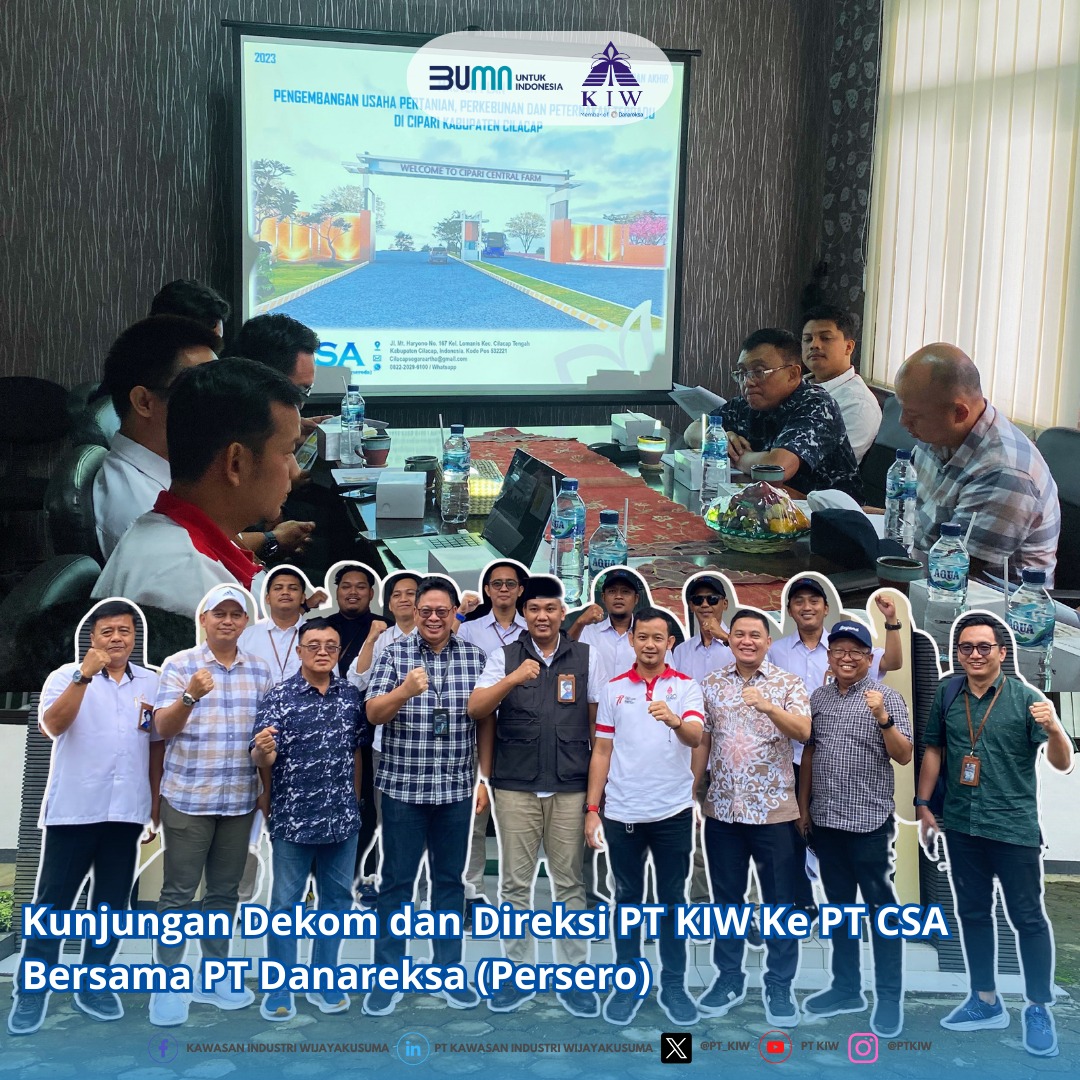 Dewan Komisaris dan Direksi PT Kawasan Industri Wijayakusuma (KIW), bersama dengan induk holdingnya, PT Danareksa (Persero), melaksanakan kunjungan ke PT Cilacap Segara Artha (Perseroda) di Cilacap pada Jumat, 02 Februari 2024. Kunjungan ini merupakan kelanjutan dari Memorandum of Understanding (MoU) yang sebelumnya telah ditandatangani antara PT KIW dan PT CSA, yang bertujuan untuk mengembangkan kawasan industri di Kabupaten Cilacap.