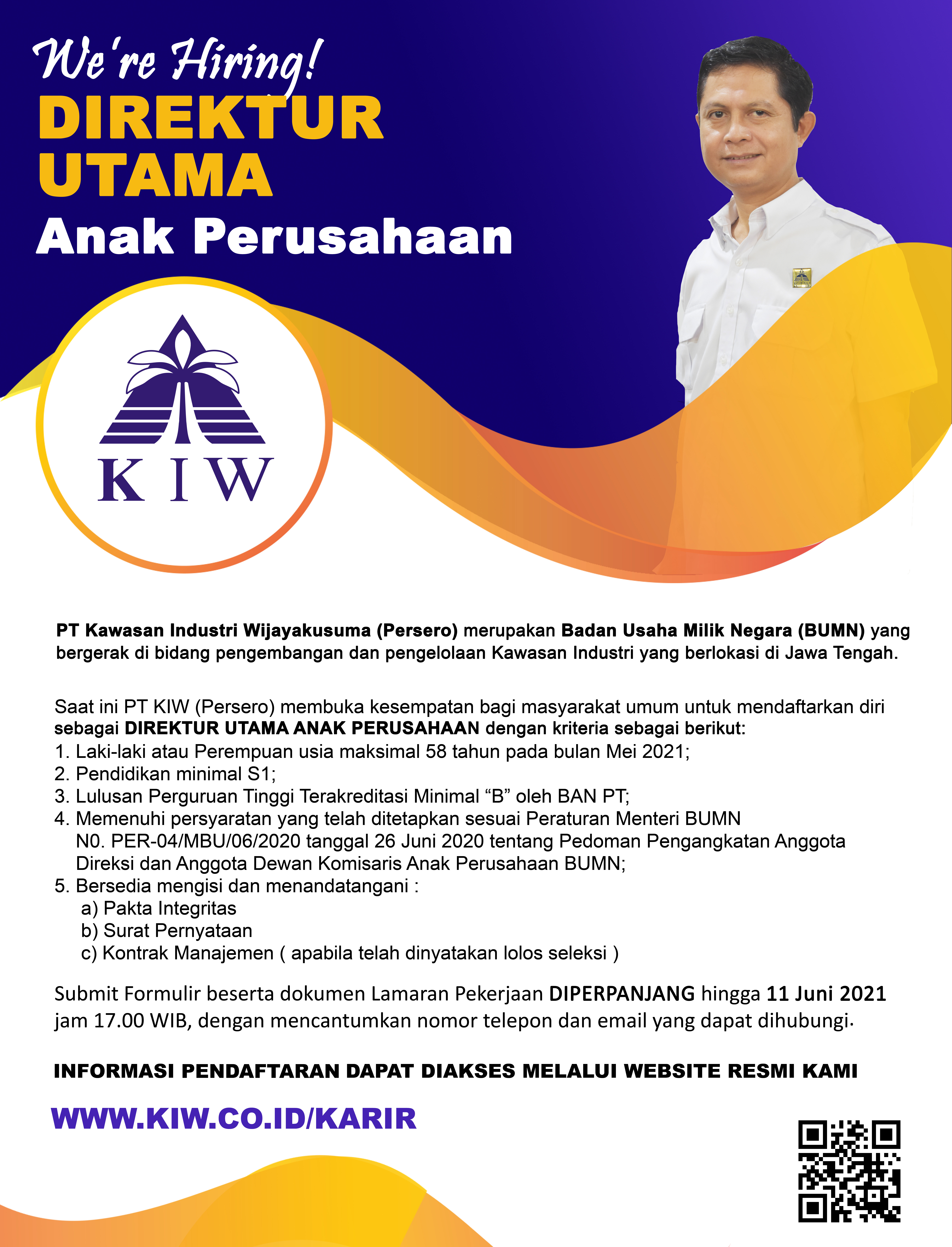 PT Kawasan Industri Wijayakusuma (PT KIW) merupakan Badan Usaha Milik Negara (BUMN) yang bergerak di bidang pengembangan dan pengelolaan Kawasan Industri yang berlokasi di Jawa Tengah. Saat ini, PT KIW (Persero) membuka kesempatan bagi masyarakat umum untuk mendaftarkan diri sebagai Anggota Dewan Komisaris PT KIW (Persero) dengan kriteria sebagai berikut: