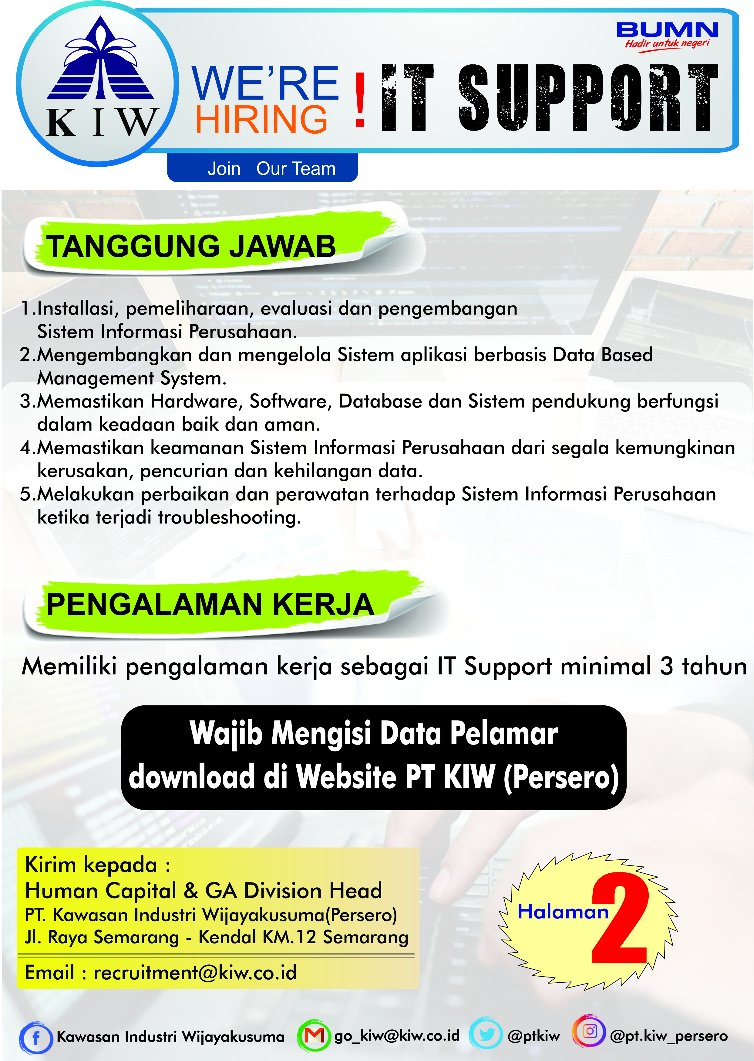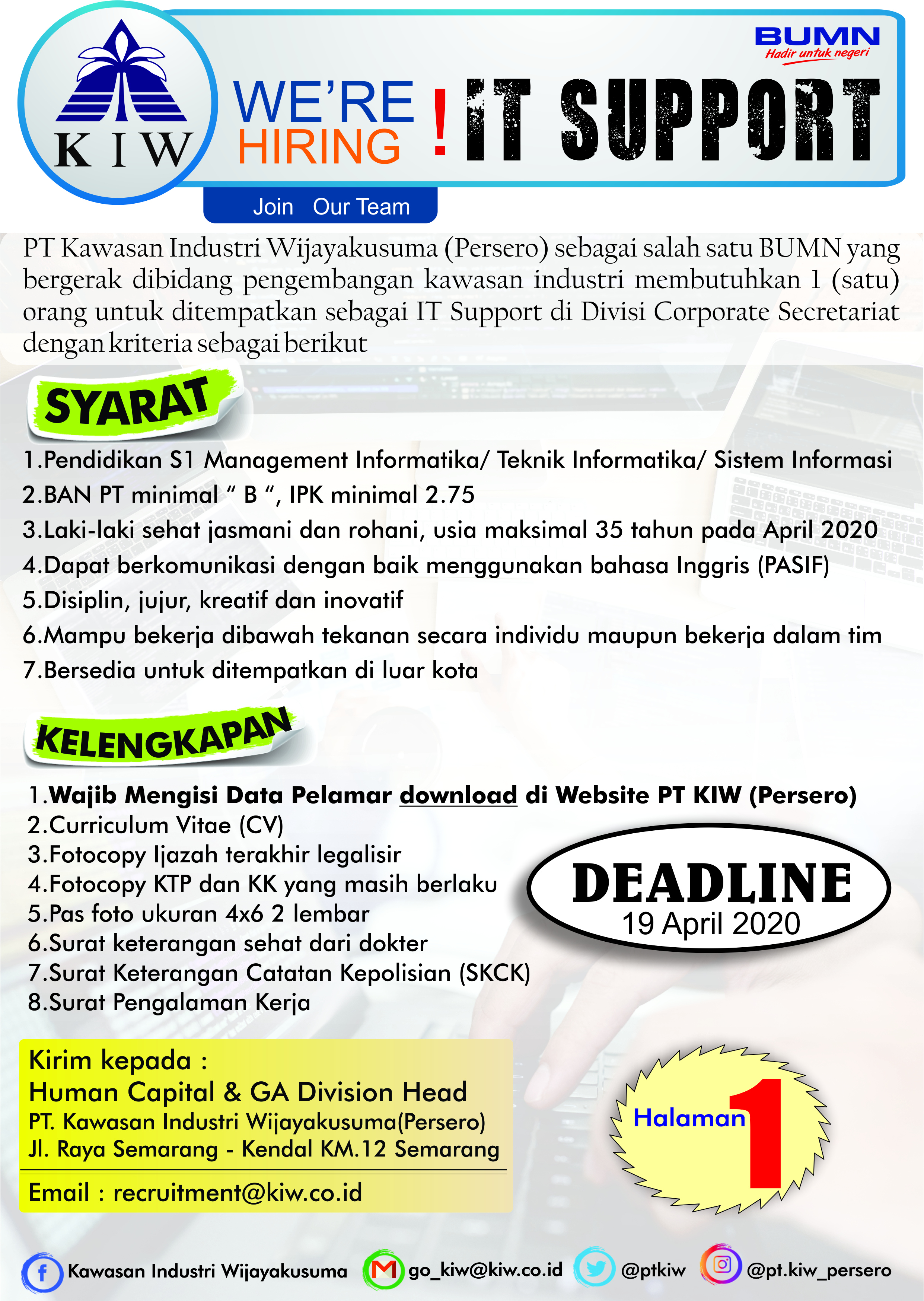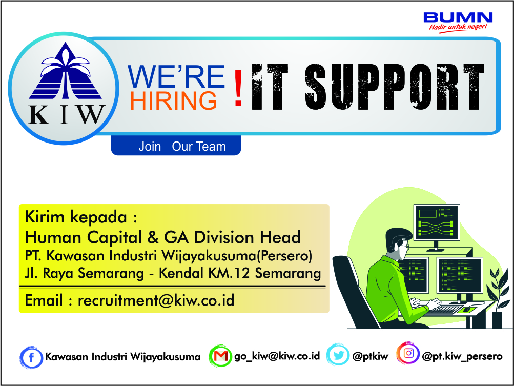 PT. Kawasan Industri Wijayakusuma (Persero) merupakan Badan Usaha Milik Negara yang bergerak di bidang pengembangan dan pengelolaan Kawasan Industri yang berlokasi di Jawa Tengah. Saat ini PT KIW (Persero) membutuhkan IT SUPPORT dengan kriteria : 1. Pendidikan S1 Management Informatika/ Teknik Informatika/ Sistem Informasi 2. BAN PT minimal “ B “, IPK minimal 2.75 3. Laki-laki sehat jasmani dan rohani, usia maksimal 35 tahun pada April 2020 4. Dapat berkomunikasi dengan baik menggunakan bahasa Inggris (PASIF) 5. Disiplin, jujur, kreatif dan inovatif 6. Mampu bekerja dibawah tekanan secara individu maupun bekerja dalam tim 7. Bersedia untuk ditempatkan di luar kota Lengkapi lamaranmu dengan : 1. Wajib Mengisi Data Pelamar download di Website PT KIW (Persero) 2. Curriculum Vitae (CV) 3. Fotocopy Ijazah terakhir legalisir 4.Fotocopy KTP dan KK yang masih berlaku 5. Pas foto ukuran 4x6 2 lembar 6. Surat keterangan sehat dari dokter 7. Surat Keterangan Catatan Kepolisian (SKCK) 8. Surat Pengalaman Kerja Dan kirim kepada : Human Capital and General Affair Division Head PT. KIW (Persero) – Jl. Raya Semarang – Kendal Km. 12 Semarang, Deadline 19 April 2020, dengan mencantumkan nomor telepon yang dapat dihubungi.Data Pelamar bisa didownload DISINI .--------------------------------------------------Jual Lahan Industri Indonesia, Jual Lahan Industri Jawa Tengah, Jual Lahan Industri Semarang, Jual Tanah Industri Indonesia, Jual Tanah Industri Semarang, Jual Kaveling Industri Indonesia, Jual Kaveling Industri Semarang, Parcel Land for Industry, Sewa Bangunan Pabrik Siap Pakai, Sewa Pabrik, Sewa Gudang, Bangunan Pabrik Siap Pakai, BPSP, Standard Factory Building, SFB, Standard Factory Building for Rent, SFB for Rent, Industial Estate, Indonesia Industrial Estate, Semarang Industrial Estate, Wijayakusuma Industrial Estate, Kawasan Industri, Kawasan Industri Indonesia, Kawasan Industri Semarang, Kawasan Industri Wijayakusuma.