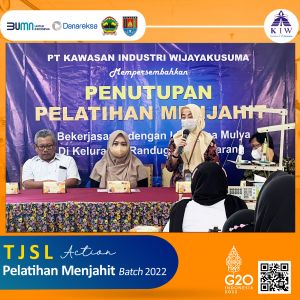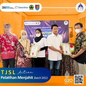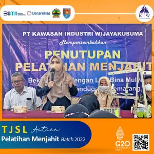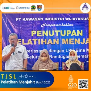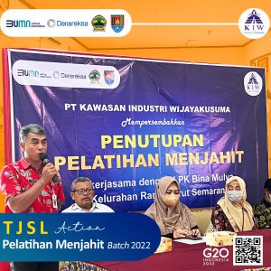 Acara penutupan dihadiri oleh Ketua LPK Bina Mulya Bapak Jauhari, Kasie Kesejahteraan Sosial Kelurahan Randugarut Bapak Yuhri, S.H, Ibu Puri dari perwakilan PT Apparel One Indonesia, dan tim TJSL dari PT KIW. Ibu Puri menjelaskan bahwa tujuan dan manfaat dari program pelatihan menjahit yang diberikan KIW ini selain memberikan dan meningkatkan skill menjahit, juga untuk memberikan kesempatan bagi peserta dengan skill yang memenuhi kualifikasi untuk dapat bekerja di PT AOI. Pak Jauhari menambahkan, bahwa selain skill menjahit yang terus ditingkatkan, masing-masing peserta juga harus mempersiapkan mental bekerja yang kuat.