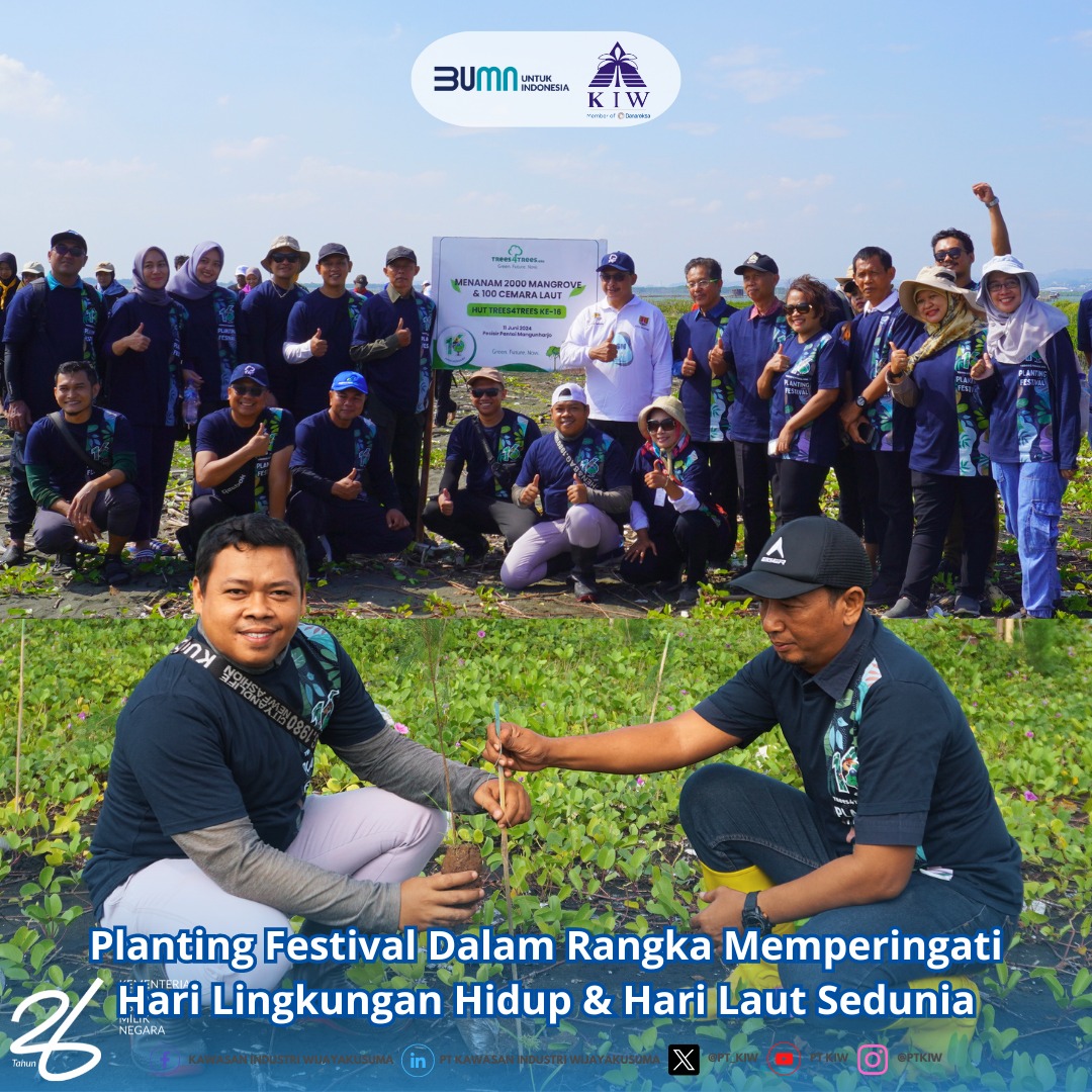 Selasa, 11 Juni 2024, Tim Tanggung Jawab Sosial dan Lingkungan (TJSL) PT Kawasan Industri Wijayakusuma (KIW) menghadiri acara Planting Festival yang diselenggarakan oleh organisasi Trees4Trees. Acara ini diadakan dalam rangka memperingati Hari Lingkungan Hidup dan Hari Laut Sedunia, bertempat di Pantai Mangunharjo, Kecamatan Tugu. Kegiatan ini merupakan kolaborasi dengan Kelompok Tani Mangrove Lestari yang dipimpin oleh Bapak Sururi, penerima penghargaan Kalpataru dari Kementerian Lingkungan Hidup tahun 2024.