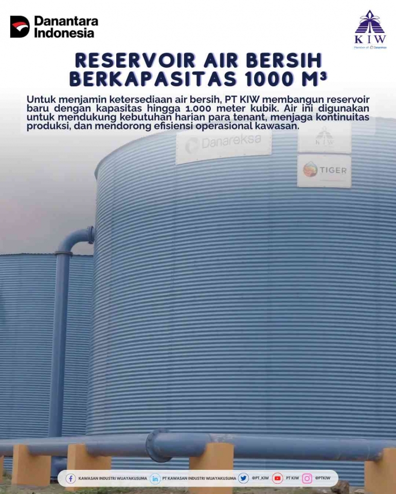 Semarang, Juli 202Reservoir Air Bersih Berkapasitas 1.000 Meter KubikGuna memenuhi kebutuhan air bersih secara kontinyu bagi tenant, KIW telah membangun reservoir baru yang mampu menampung air hingga 1.000 m. Infrastruktur ini mendukung kestabilan operasional tenant dan memastikan pasokan air tetap terjaga dalam berbagai kondisi.