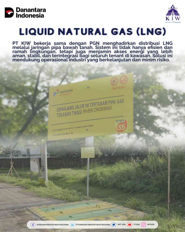 Distribusi Gas Alam Bawah Tanah (LNG) melalui Kerja Sama dengan PGNPT KIW bersama Perusahaan Gas Negara (PGN) telah membangun sistem distribusi gas bawah tanah untuk menyediakan akses energi yang aman, efisien, dan terintegrasi bagi tenant. Penggunaan LNG sebagai energi alternatif mendukung pengurangan emisi dan risiko kebocoran, sekaligus memperkuat stabilitas energi kawasan industri.