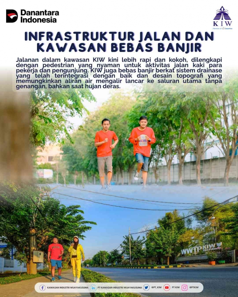 Peningkatan Kualitas Jalan dan Sistem Bebas BanjirSeluruh jalan di dalam kawasan kini telah diperbaiki dan dilengkapi dengan fasilitas pedestrian yang nyaman dan aman. Selain itu, PT KIW telah menerapkan sistem drainase terintegrasi yang mampu mengalirkan air hujan secara efisien ke saluran utama, sehingga menjadikan kawasan bebas genangan dan banjir, bahkan saat curah hujan tinggi.