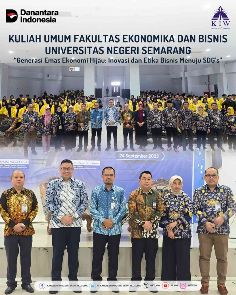 Semarang -- PT Kawasan Industri Wijayakusuma (KIW) terus memperkuat perannya dalam mendorong terwujudnya ekonomi hijau dan pembangunan berkelanjutan. Hal ini ditunjukkan melalui partisipasi Direktur Utama PT KIW, Bapak Ahmad Fauzie Nur, yang menjadi narasumber dalam Kuliah Umum (Studium Generale) Fakultas Ekonomika dan Bisnis Universitas Negeri Semarang (UNNES) pada Rabu, 24 September 2025.