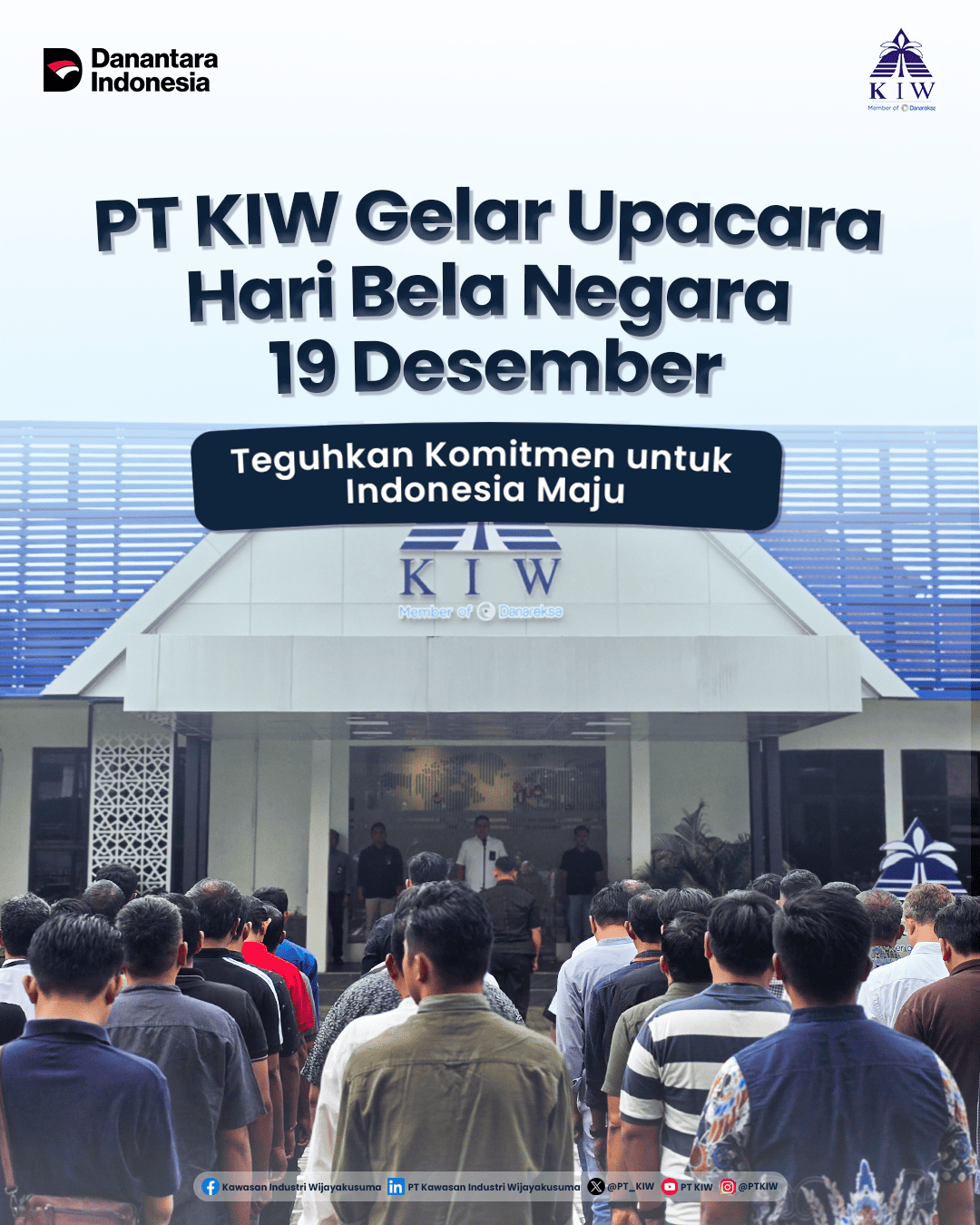 Dalam rangka memperingati Hari Bela Negara yang jatuh setiap tanggal 19 Desember, PT Kawasan Industri Wijayakusuma (PT KIW) telah menyelenggarakan upacara peringatan yang berlangsung di Lapangan PT KIW. Kegiatan ini dipimpin langsung oleh Direktur Utama PT KIW, Ahmad Fauzie Nur, dan diikuti oleh seluruh karyawan serta jajaran manajemen perusahaan.