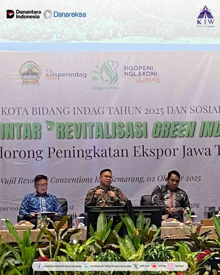 Kamis, 02 Oktober 2025 --- Direktur Utama PT Kawasan Industri Wijayakusuma (PT KIW), Ahmad Fauzie Nur, hadir sebagai narasumber dalam kegiatan Rakor Kabupaten/Kota Bidang Indag Tahun 2025 yang dirangkaikan dengan Sosialisasi Rengganis Pintar bertema "Revitalisasi Green Industry Guna Mendorong Peningkatan Ekspor Jawa Tengah".