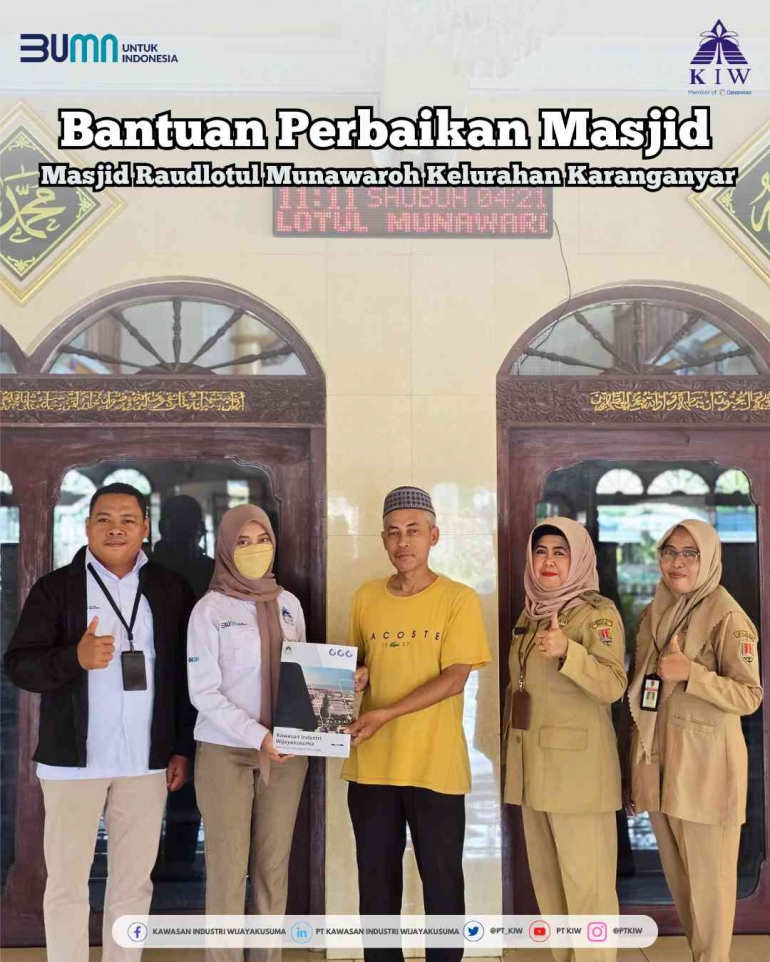 Semarang -- PT Kawasan Industri Wijayakusuma (KIW) kembali menunjukkan komitmennya dalam menjalankan program Tanggung Jawab Sosial dan Lingkungan (TJSL) melalui kegiatan sosial di wilayah operasional perusahaan. Kali ini, bantuan disalurkan untuk mendukung perbaikan sarana ibadah di Kota Semarang, tepatnya di Masjid Raudlotul Munawaroh yang berlokasi di Kecamatan Karanganyar, Kecamatan Tugu.