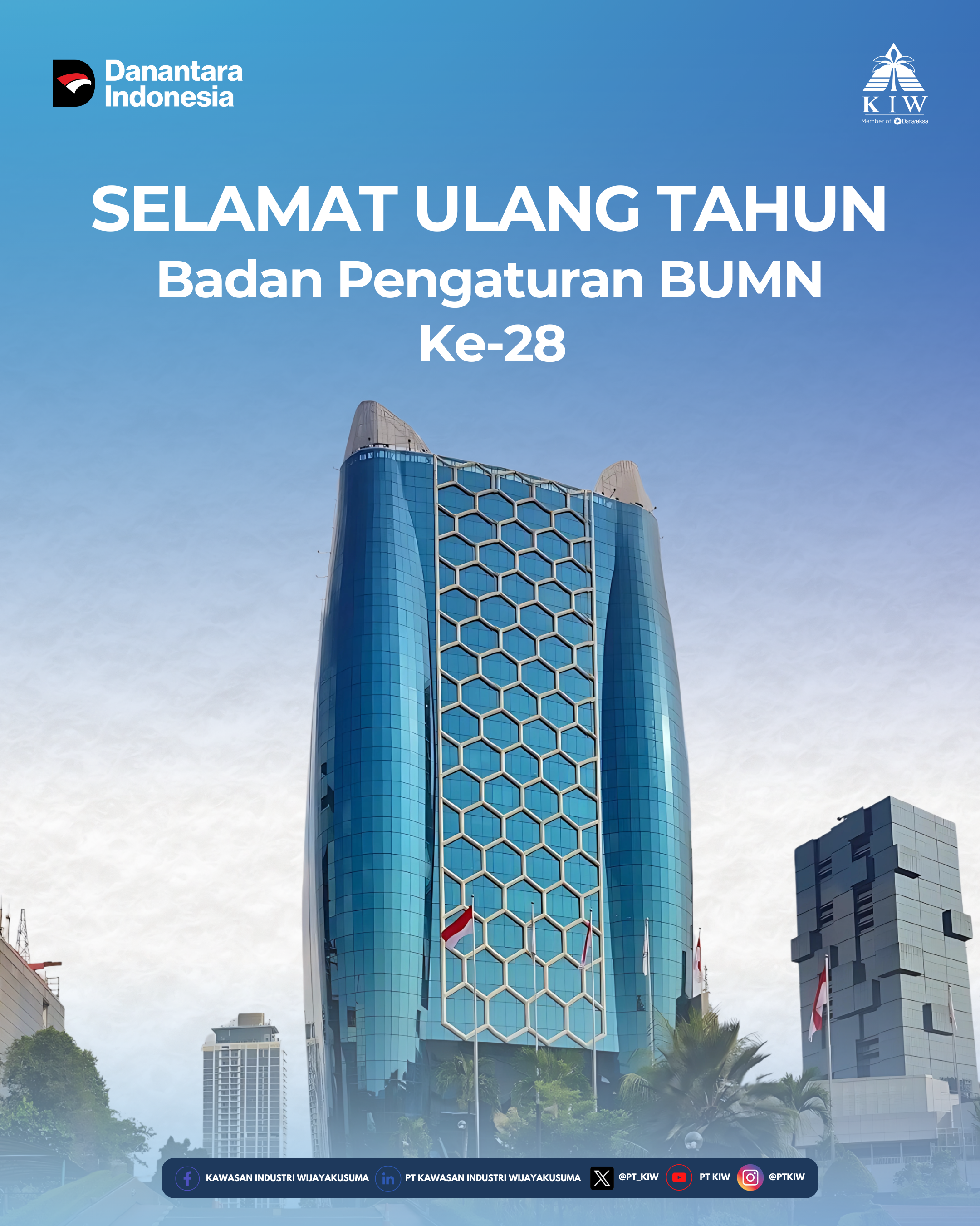 Dalam rangka memperingati Hari Ulang Tahun ke-28 Badan Pengaturan BUMN yang jatuh pada 13 April, PT Kawasan Industri Wijayakusuma (KIW) menyampaikan ucapan selamat sekaligus apresiasi atas peran strategis Badan Pengaturan BUMN dalam mendorong kemajuan tata kelola perusahaan negara di Indonesia.