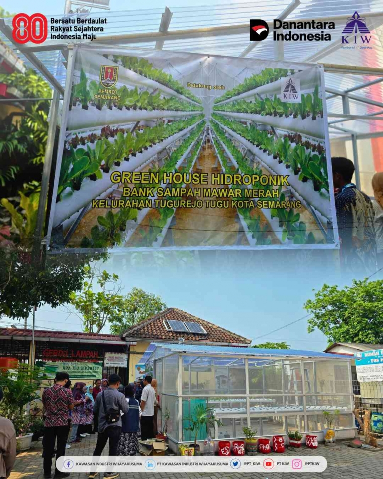 Semarang, 5 Agustus 2025 -- PT Kawasan Industri Wijayakusuma melalui Tim Tanggung Jawab Sosial dan Lingkungan (TJSL) melaksanakan penyerahan bantuan secara simbolis berupa pembangunan Green House dan media tanam Hidroponik di Bank Sampah Mawar Merah, yang berlokasi di Kelurahan Tugurejo, Kecamatan Tugu, Kota Semarang.