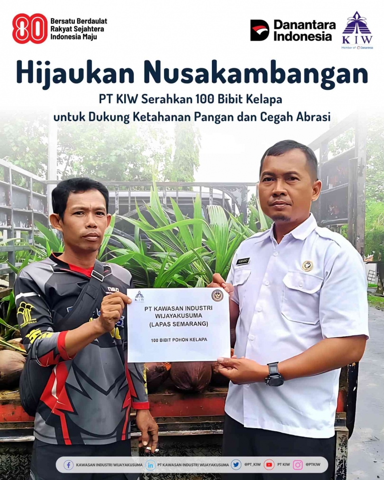 Semarang -- PT Kawasan Industri Wijayakusuma (PT KIW) melalui Tim Tanggung Jawab Sosial dan Lingkungan (TJSL) menunjukkan komitmennya dalam mendukung pelestarian lingkungan serta peningkatan ketahanan pangan di wilayah pesisir. Hal ini diwujudkan melalui penyerahan bantuan 100 bibit pohon kelapa kepada Lembaga Pemasyarakatan Kelas I Batu Nusakambangan.