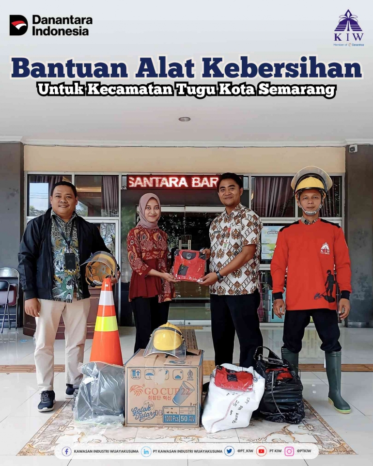 PTKawasanIndustriWijayakusuma (KIW) melalui Tim Tanggung Jawab Sosial dan Lingkungan (TJSL) kembali merealisasikan komitmennya terhadap pembangunan berkelanjutan. PT KIW menyalurkan bantuan berupa cleaning Tshirts, safety boots, traffic cones, dan fullface safety helmets kepada Pemerintah KecamatanTugu, KotaSemarang. Seremoni penyerahan berlangsung di halaman Kantor KecamatanTugu dan diterima langsung oleh perwakilan kecamatan.