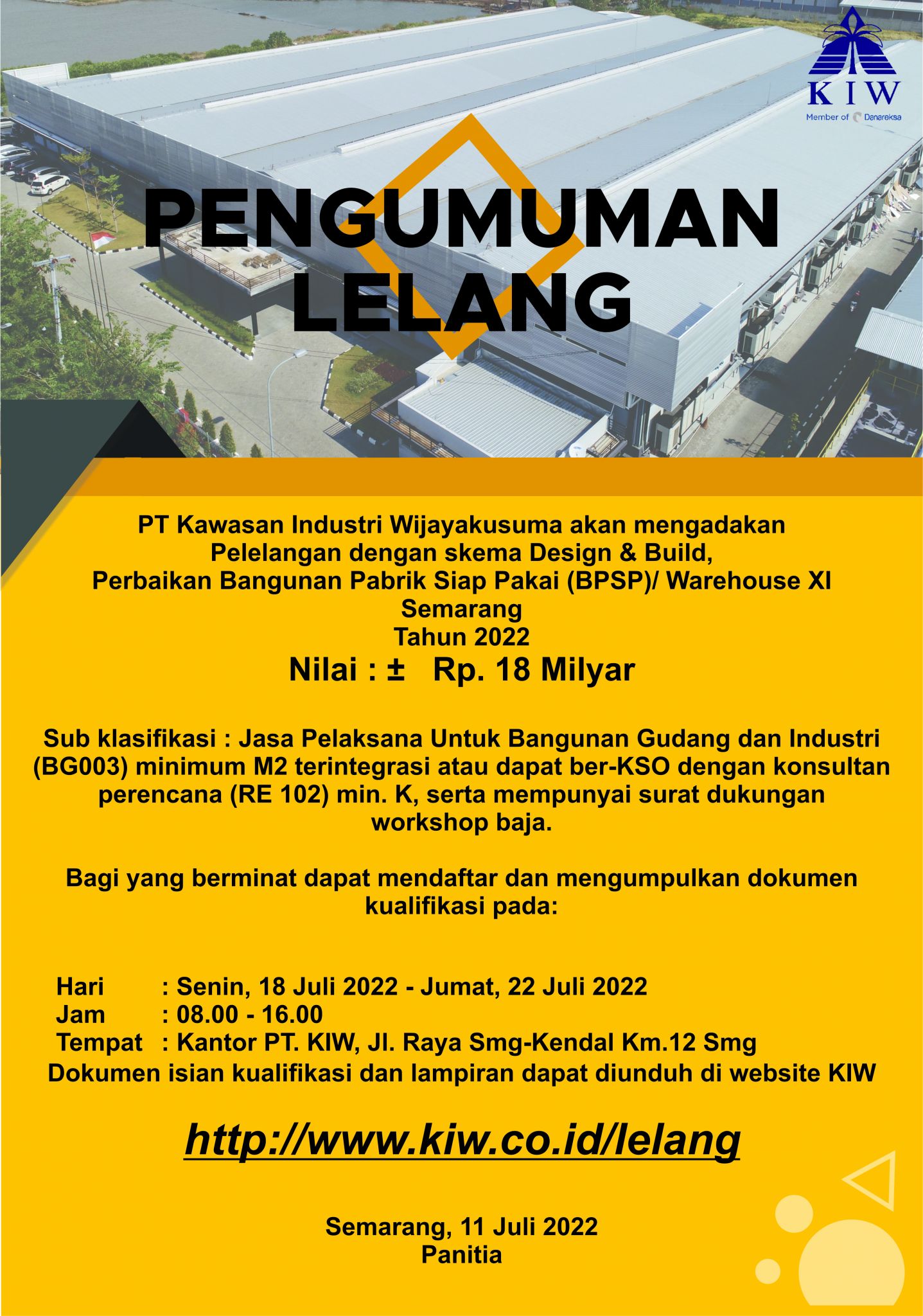 KIW telah membangun bangunan sewa sebagai salah satu usaha utama seperti Bangunan Pabrik Siap Pakai (BPSP) antara lain Bangunan yang meliputi BPSP I,II,III,IV,V,VI,VII,VII,IX dan X yang telah tersewa dengan peruntukan logistik, garment dll. Melihat kondisi perkembangan minat terhadap bangunan-bangunan sewa di KIW yang selalu mempunyai dampak positif, serta mempertimbangkan permintaan pasar dan sesuai RKAP tahun 2022 maka dilakukan BPSP/Warehouse XI dengan metode pengadaan design and build.