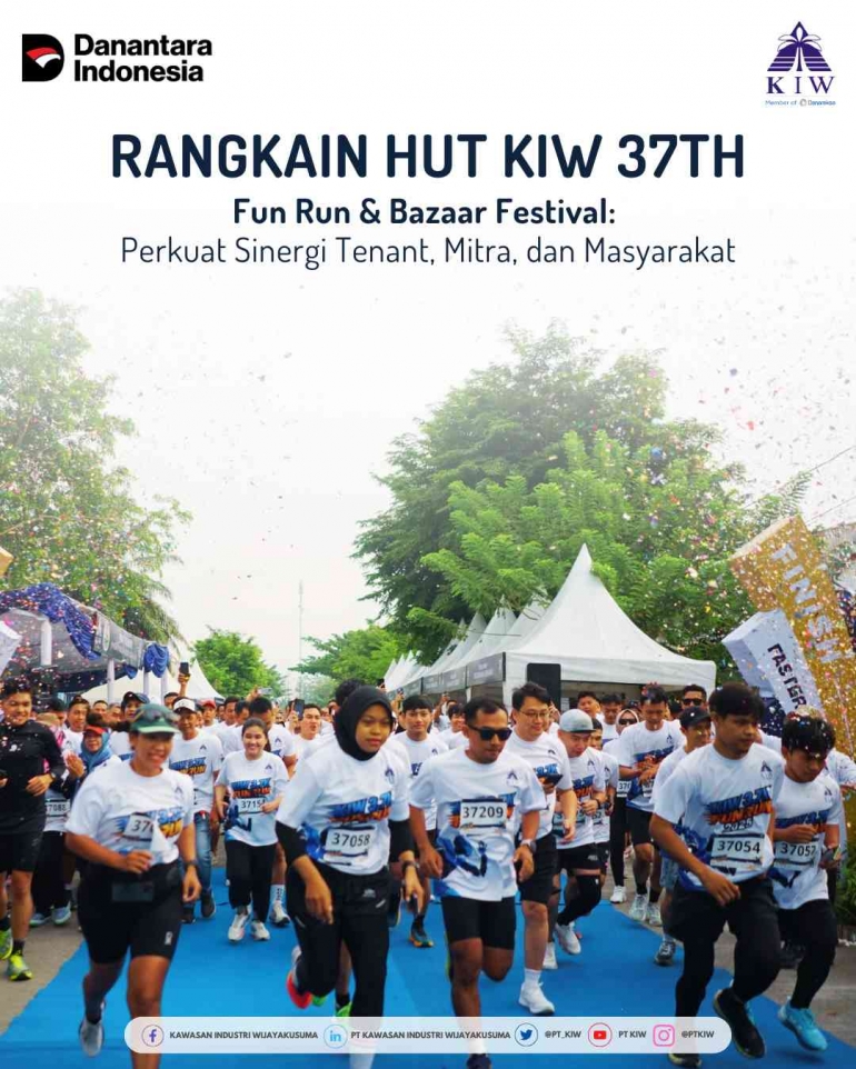 Semarang, 4 Oktober 2025 -- PT Kawasan Industri Wijayakusuma (KIW) sebagai bagian dari Holding BUMN Danareksa memperingati hari jadinya yang ke-37 yang jatuh pada 7 Oktober 2025 dengan semangat kebersamaan dan kebermanfaatan. Sesuai dengan mottonya, "Growing Stronger, Moving Faster", Perayaan tahun ini tidak hanya menghadirkan keceriaan, tetapi juga menggambarkan peran strategis KIW sebagai motor penggerak ekonomi sekaligus mitra masyarakat sekitar kawasan industri.