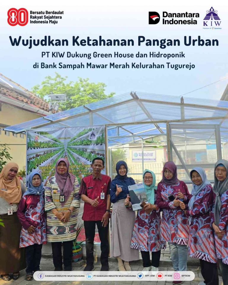 Semarang, 5 Agustus 2025 -- PT Kawasan Industri Wijayakusuma melalui Tim Tanggung Jawab Sosial dan Lingkungan (TJSL) melaksanakan penyerahan bantuan secara simbolis berupa pembangunan Green House dan media tanam Hidroponik di Bank Sampah Mawar Merah, yang berlokasi di Kelurahan Tugurejo, Kecamatan Tugu, Kota Semarang.