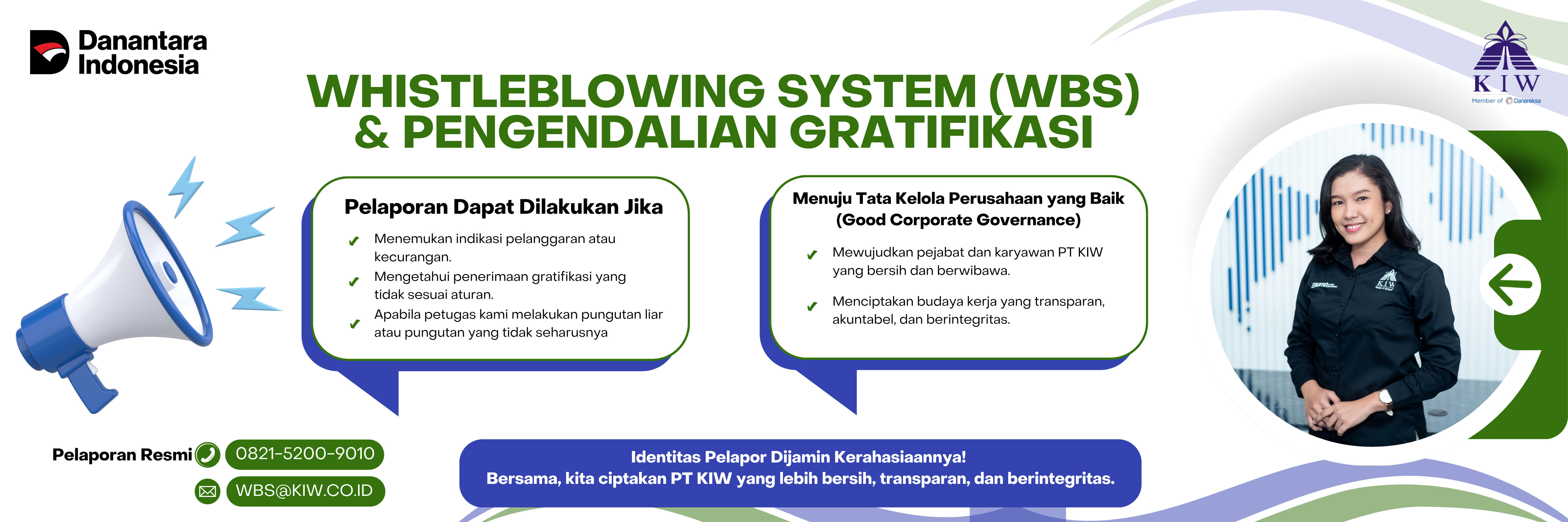 为落实公司良好治理(Good Corporate Governance)原则,并打造PT KIW清廉有威信的干部员工队伍,现发布董事会决议,制定关于举报系统(WBS)、礼品收受管控及礼品管控单位(UPG)组建的公司政策。