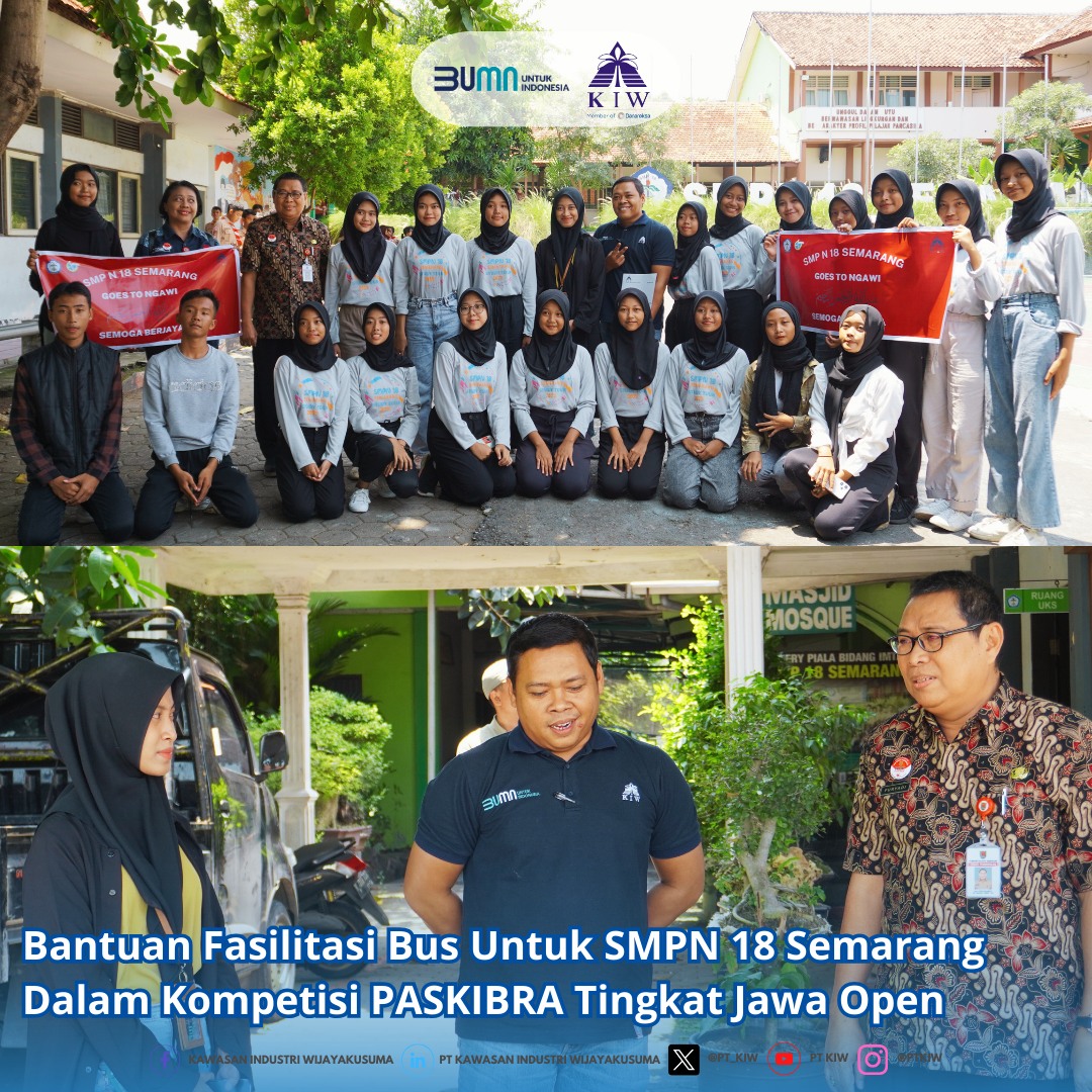 Tim TJSL PT Kawasan Industri Wijayakusuma (KIW) memberikan bantuan simbolis berupa akomodasi bus pada hari Jum'at, tanggal 16 Februari 2024, kepada SMP Negeri 18 Kota Semarang. Bantuan ini diserahkan sebagai upaya untuk mendukung partisipasi sekolah tersebut dalam Kompetisi Paskibra tingkat SMP dan SMA Tingkat Jawa Open yang diselenggarakan oleh SMA Negeri 2 Ngawi.