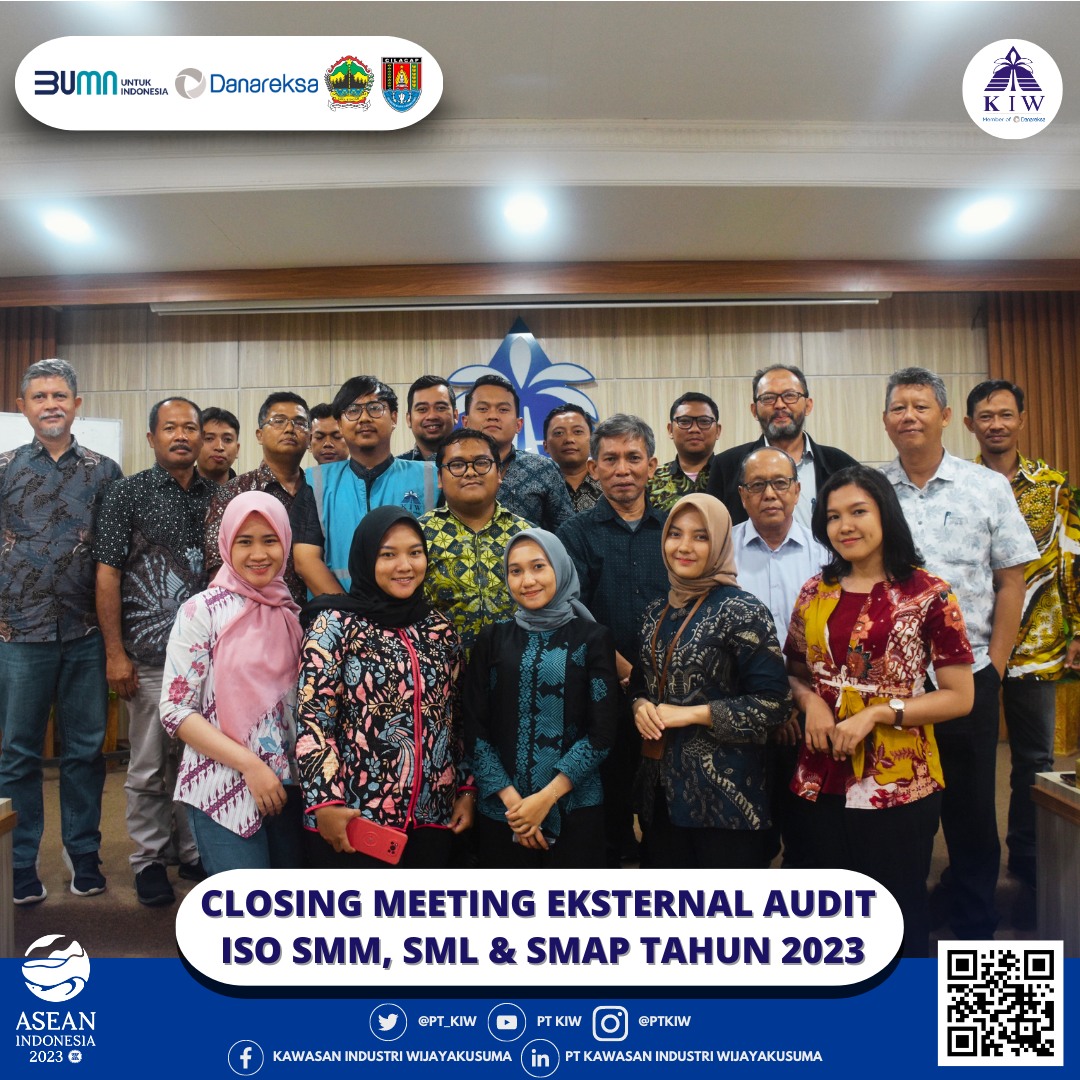 PT Kawasan Industri Wijayakusuma (PT KIW) mengadakan Closing Meeting untuk audit ISO 37001:2016, ISO 9001:2015 (Re-Certification Audit), dan ISO 14001:2015 (SA-1). Pertemuan ini diadakan di ruang rapat PT KIW pada hari Kamis, tanggal 13 Juli 2023.