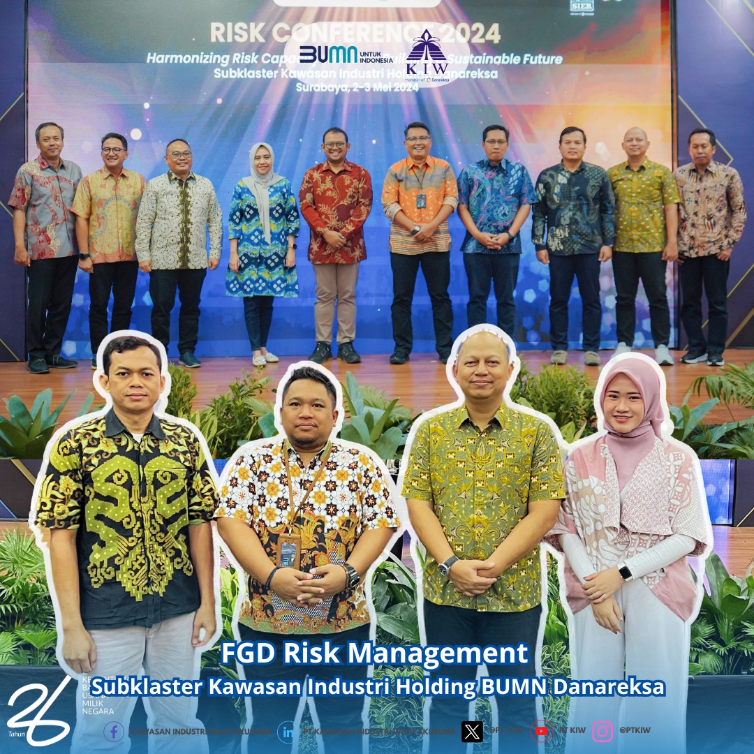 PT Kawasan Industri Wijayakusuma (KIW) yang diwakili oleh Direktur Keuangan & Manajemen Risiko, Bapak Riki Indrianto, bersama dengan tim Manajemen Risiko (MR), turut serta dalam kegiatan Focus Group Discussion (FGD) tentang Manajemen Risiko Subklaster Kawasan Industri Holding BUMN Danareksa. Kegiatan ini berlangsung pada tanggal 2 hingga 3 Mei 2024, di Gedung Perkantoran PT Surabaya Industrial Estate Rungkut (SIER), Surabaya.
