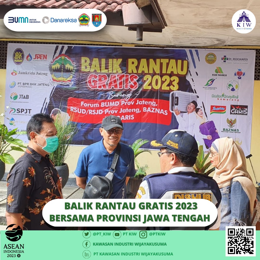 PT Kawasan Industri Wijayakusuma (KIW) berpartisipasi dalam acara “Balik Rantau Gratis 2023 Bareng BUMD Jawa Tengah†yang diselenggarakan oleh Pemprov Jateng yang upacara pemberangkatan pemudiknya dilakukan pada Sabtu, 29 April 2023 di Boyolali. Mudik Gratis Arus Balik ini dikhususkan untuk warga Jateng dengan tujuan Jabodetabek & Bandung. Pemberangkatan dilaksanakan secara simbolis serentak di 3 titik pemberangkatan, Asrama Haji Donohudan 32 bus, Terminal Mangkang Semarang 11 bus dan Terminal Bulupitu Purwokerto 13 bus oleh Sekretaris Daerah Provinsi Jawa Tengah, Sumarno,SE, MM.