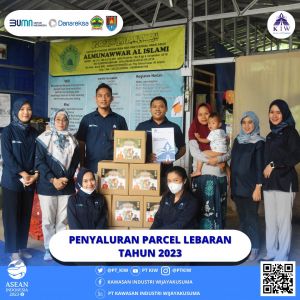 PT Kawasan Industri Wijayakusuma (KIW) melaksanakan kegiatan penyaluran parcel lebaran tahun 2023 dengan tujuan untuk memberikan bantuan kepada panti asuhan dan pondok pesantren di sekitar wilayah Semarang. Kegiatan ini dilaksanakan pada hari Selasa, tanggal 11 April 2023, dan diikuti oleh beberapa karyawan PT KIW. Adapun daftar penerima bantuan parcel meliputi Yayasan Darul Karim Semarang, Panti Asuhan Al Hikmah, Yayasan Daarus Sa’id, Yayasan Al Munawar Al Islam, dan PP. Khuffadzil Qur’an “Daruttaqwaâ€.