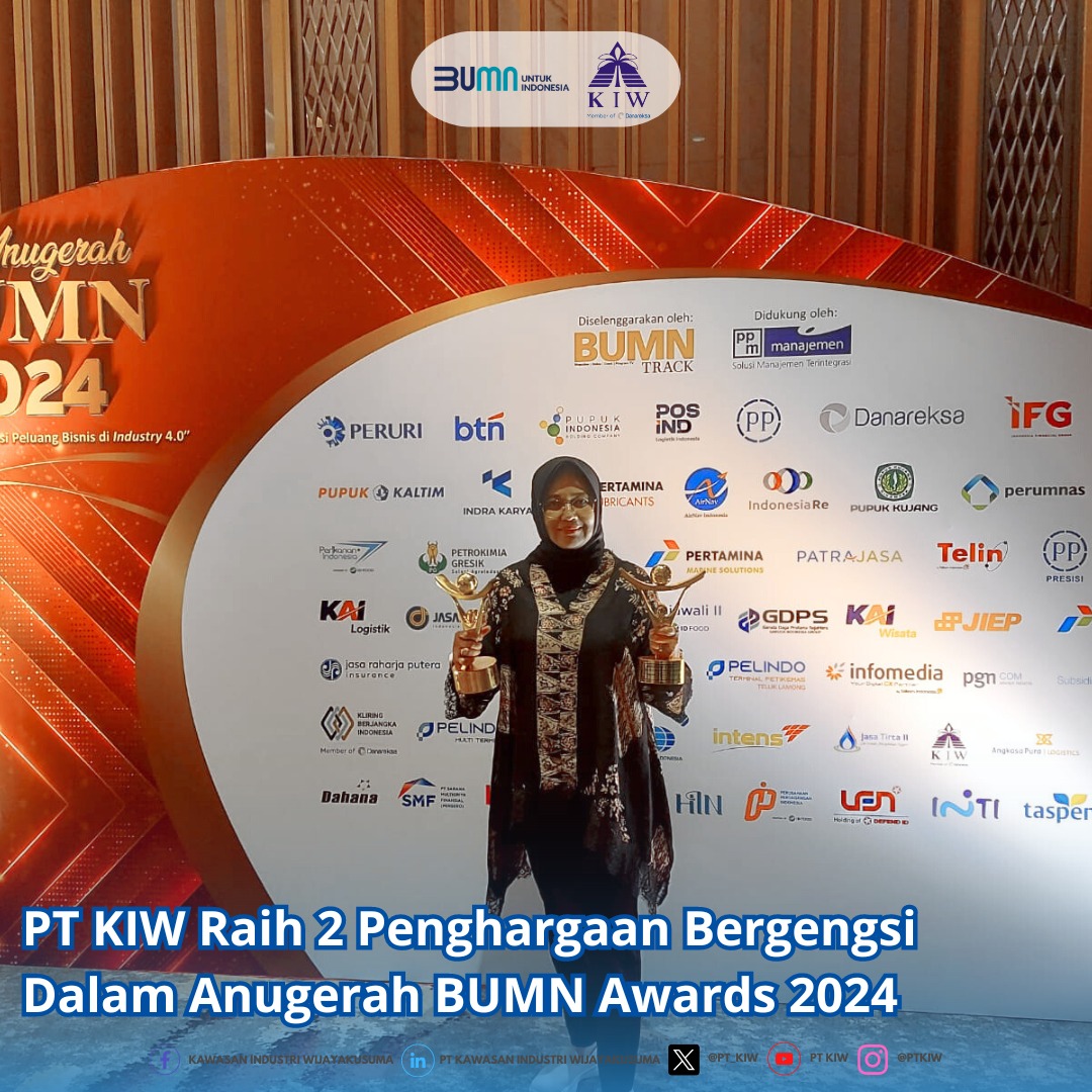 Prestasi gemilang PT KIW tercermin dalam dua penghargaan yang diterimanya. Pertama, Bapak Ahmad Fauzie Nur,Direktur Utama PT KIW, meraih penghargaan sebagai Best CEO in Providing Industrial Area Services, mengukuhkan perannya sebagai pemimpin yang berdedikasi dan inovatif dalam menyediakan layanan area industri yang terbaik. Kedua, PT KIW secara keseluruhan diakui sebagai Best Corporate in Business Development and Collaboration with Integrated Industrial Area Developers Anak Perusahaan BUMN, menegaskan komitmen perusahaan dalam mengembangkan bisnis dan menjalin kerjasama yang erat dengan pengembang area industri terintegrasi di bawah naungan Kementerian BUMN.