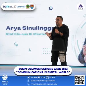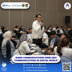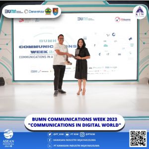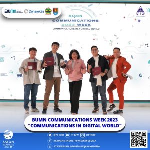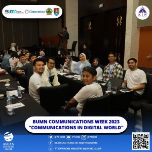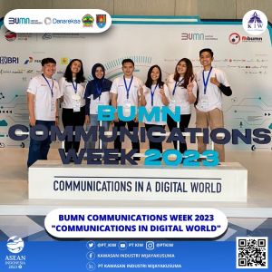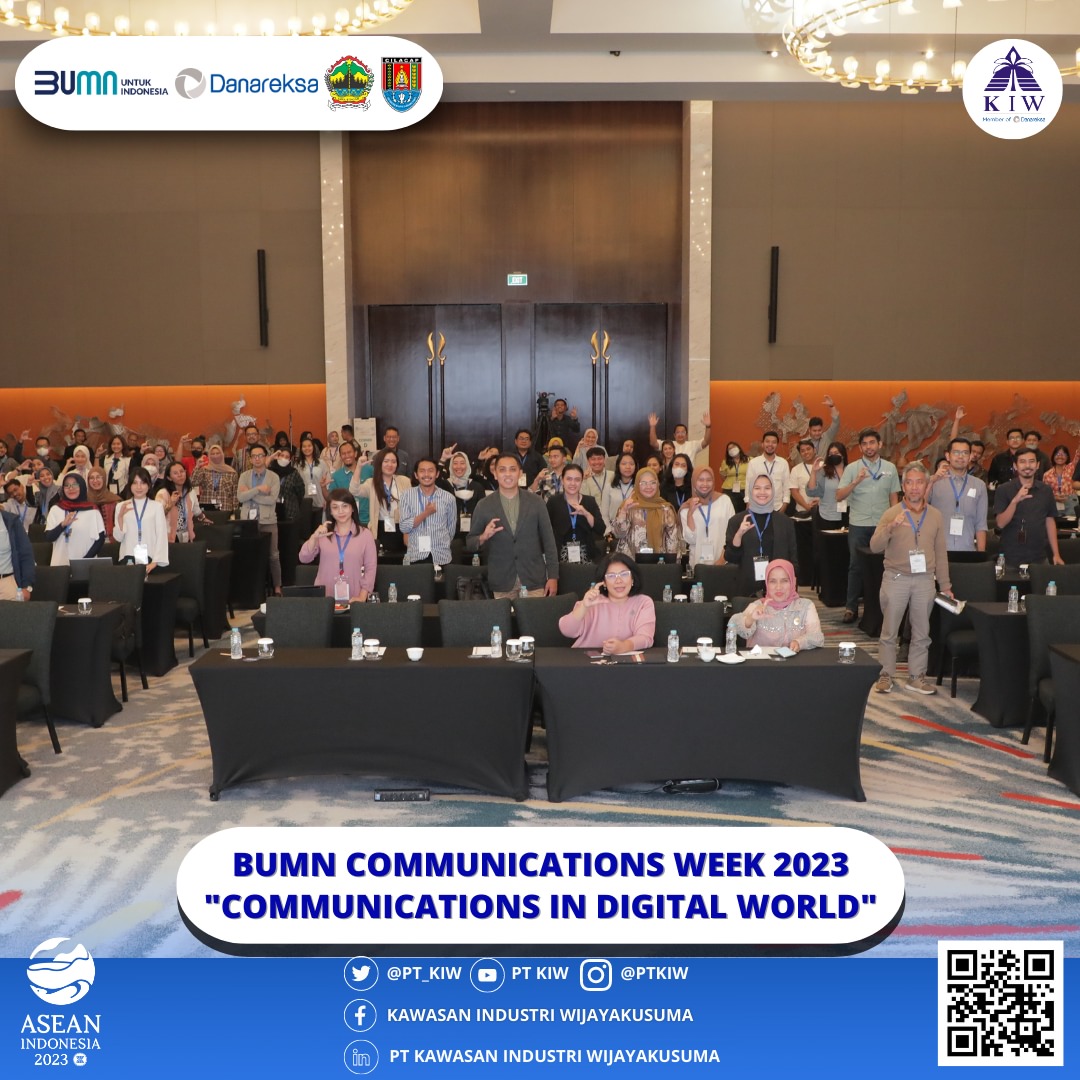 PT Kawasan Industri Wijayakusuma (KIW) dengan bangga berpartisipasi dalam gelaran BUMN Communications Week 2023 yang diadakan di Pullman Hotel Bandung pada tanggal 5-6 Mei 2023. Kegiatan ini bertujuan untuk meningkatkan kompetensi praktisi komunikasi di era disrupsi teknologi digital, dengan tema "Communications in Digital World". Acara ini diharapkan menjadi sarana bagi executive BUMN untuk mempelajari lebih dalam mengenai pentingnya strategi komunikasi dalam meningkatkan reputasi pemimpin BUMN dan citra korporasi.