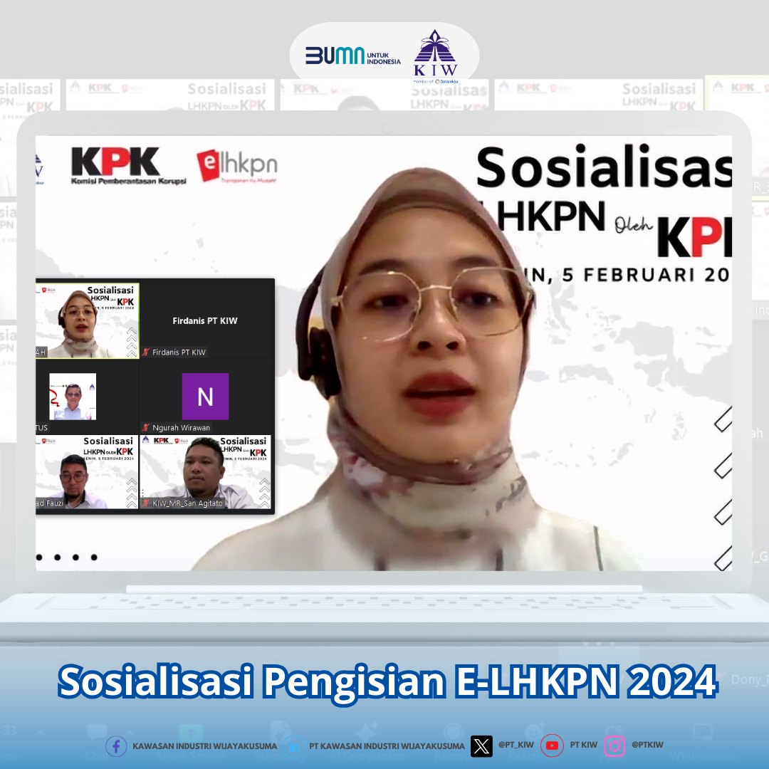 Pada hari Senin, 05 Februari 2024 PT Kawasan Industri Wijayakusuma (KIW) mengadakan acara Sosialisasi Pengisian dan Pelaporan e-LHKPN bagi seluruh karyawan. Acara yang berlangsung melalui platform Zoom meeting ini membahas mengenai bagaimana pengisian e-LHKPN secara online yang dipandu oleh ibu Hafidha Rifqiah, seorang Spesialis pendaftaran dan pemeriksaan LHKPN dari Komisi Pemberantasan Korupsi (KPK).
