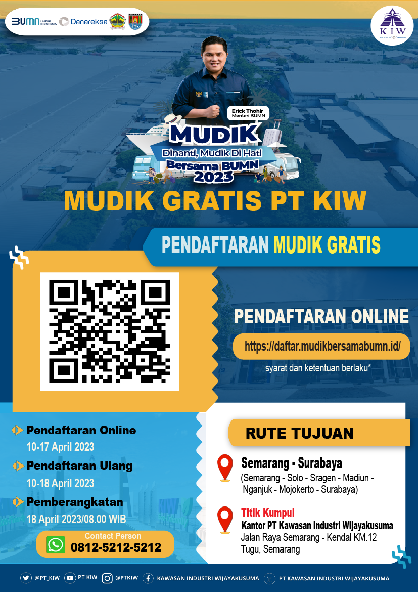 PT KAWASAN INDUSTRI WIJAYAKUSUMA Jalan Semarang-Kendal Km 12, Semarang, Jawa Tengah Call Center : Marketing : 081211118022 WBS : 081211118021 Telp : (024) 8662156 Fax : (024) 8661476 Email : [email protected] Website : www.kiw.co.id -------------------------------------------------- #MudikDiNantiMudikDiHatiBarengBUMN2023 #Mudik2023 #PTKIW #KawasanIndustriWijayakusuma #BUMNUntukIndonesia