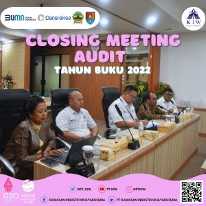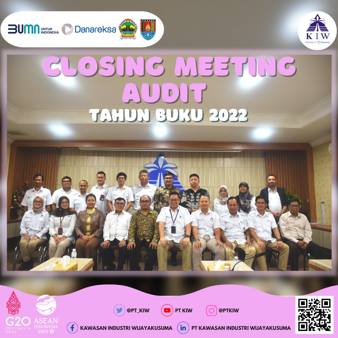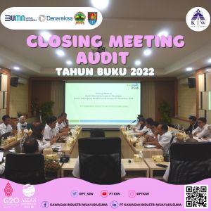 PT Kawasan Industri Wijayakusuma (KIW) telah melaksanakan Closing Meeting Audit Umum atas Laporan Keuangan Tahun Buku 2022 PT KIW dan Entitas Anak Perusahaan pada hari Senin tanggal 20 Februari 2023. Kegiatan ini dilaksanakan di tempat rapat PT KIW dan dihadiri oleh beberapa perwakilan penting dari perusahaan, seperti Komisaris PT KIW bapak Anton Santosa, Direktur Utama PT KIW Bapak Ahmad Fauzie Nur, Direktur Keuangan dan MR Bapak Riki Indrianto, Direktur Keuangan PT KITB Ibu Evi Afiatin dan Direktur PT PWS Bapak Panggah Tuhu Prasetyo.
