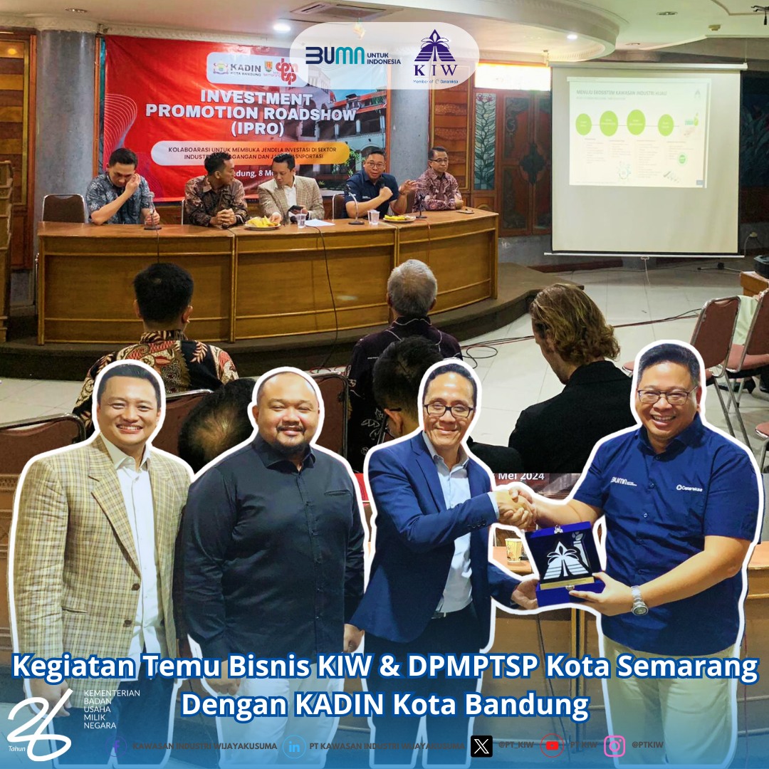 PT Kawasan Industri Wijayakusuma (KIW) menghadiri kegiatan Temu Bisnis bersama Dinas Penanaman Modal dan Pelayanan Terpadu Satu Pintu (DPMPTSP) Kota Semarang serta KADIN Kota Bandung pada hari Rabu, 08 Mei 2024. Acara ini digelar di Kantor KADIN Kota Bandung yang terletak di Jalan Telagabodas.
